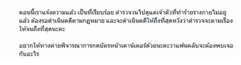 ตอนนี้เราแจ้งความแล้วเป็นที่เรียบร้อย ตำรวจวนไปดูแต่เจ้าตัวที่ทำร้ายร่างกายไม่อยู่แล้ว ต้องรอดำเนินคดีตามกฏหมาย และจะดำเนินคดีให้ถึงที่สุดหวังว่าตำรวจจะตามเรื่องให้จนถึงที่สุดนะคะ อยากให้ทางค่ายพิจารณาการกดบัตรหน้าเคาน์เตอร์ด้วยนะคะว่าแฟนคลับจะต้องพบเจอกับอะไร