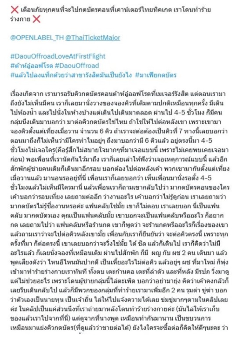 จากกรณีที่ก่อนหน้านั้น ได้มีคลิปออกมาเป็น จากทาง X ได้โพสต์ลงในแอคเคาต์ส่วนตัว @lovecats052 เตือนภัยทุกคนที่จะไปกดบัตรคอนที่เคาน์เตอร์ไทยทิคเกต เหตุเพราะโดนทำร้ายร่างกายและข่มขู่ ขณะต่อคิวซื้อบัตรว่า เรื่องเกิดจากเรามารอรับคิวกดบัตรคอนต้าห์อู๋ออฟโรดที่เมเจอร์รังสิต แต่ตอนเรามาถึงยังไม่เห็นมีคน เราก็เลยมานั่งวางของจองคิวที่เดิมตามปกติเหมือนทุกครั้ง มีเดินไปห้องน้ำ และไปนั่งในห้างบ้างแต่เดินไปเดินมาตลอด ผ่านไป 4-5 ชั่วโมง ก็มีคนกลุ่มนึงเดินมาบอกว่า มาต่อคิวกดบัตรใช่ไหม ถ้าใช่ให้ไปต่อหลังเขา เพราะเขามาจองคิวตั้งแต่เที่ยงเมื่อวาน จำนวน 6 คิว ถ้าเราจะต่อต้องเป็นคิวที่ 7 ทางนี้เลยบอกว่าตอนมาถึงก็ไม่เห็นว่ามีใครทำไมอยู่ๆ ถึงมาบอกว่ามี 6 คิวแล้ว อยู่ตรงนี้มา 4-5 ชั่วโมงไม่เจอใคร(คือรู้สึกไม่สบายใจมากๆ ที่มาเจอแบบนี้ เพราะไม่เคยพบเคยเจอมาก่อน)