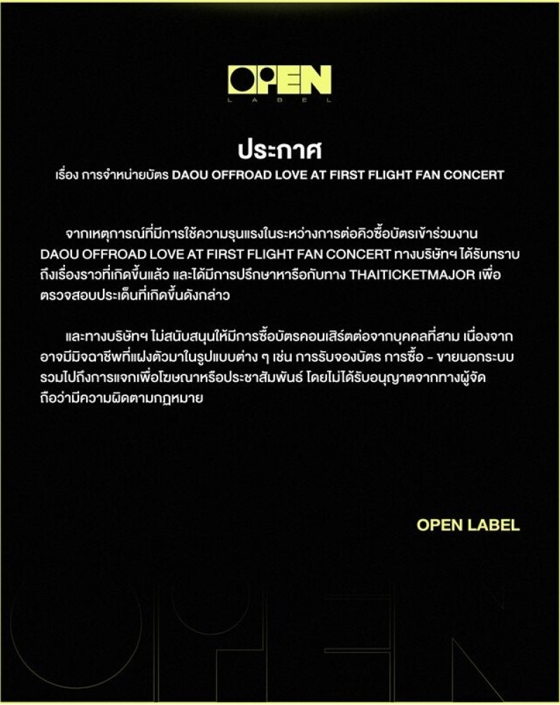 ทางค่ายต้นสังกัดของ ต้าห์อู๋-ออฟโรด ก็ไม่นิ่งนอนใจ ได้ออกมาแถลงการณ์เป็นที่เรียบร้อย โดยไม่สนับสนุนให้มีการซื้อบัตรคอนเสิร์ตต่อจากบุคคลที่สาม เนื่องจากอาจมีมิจฉาชีพที่แฝงตัวมาในรูปแบบต่างๆ เช่น การรับจองบัตร การซื้อ-ขายนอกระบบ รวมไปถึงการแจกเพื่อโฆษณาหรือประชาสัมพันธ์ โดยไม่ได้รับอนุญาตจากทางผู้จัด ถือว่ามีความผิดทางกฏหมาย