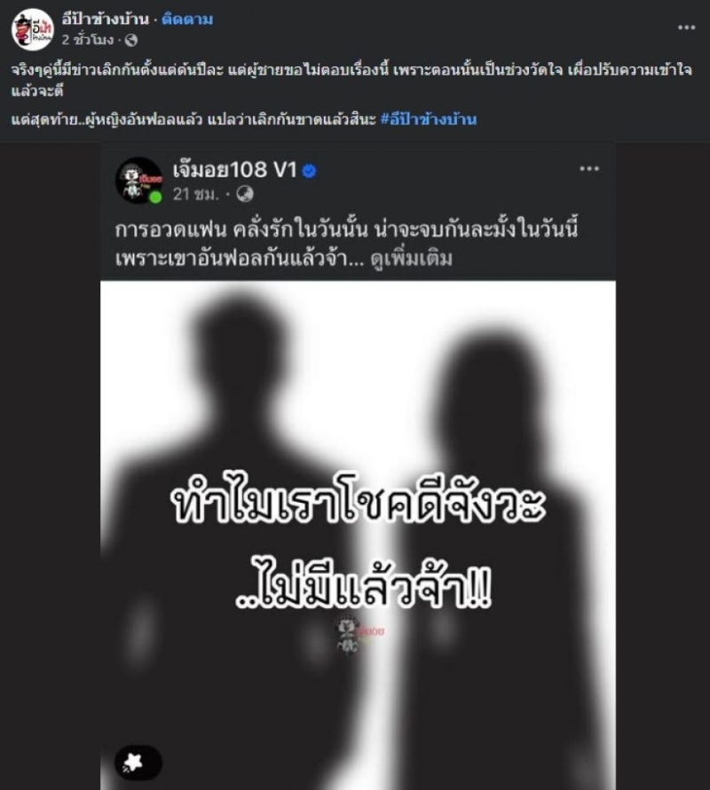 ก็ต้องบอกเลยว่า เป็นประเด็นร้อนของคู่รักคนดังคู่หนึ่งกันเลยทีเดียว สำหรับ คู่ของพระเอกหนุ่มหน้าตี๋ที่ได้ถูกโยงถึงข่าวลือดังกล่าว อย่าง กระทิง ขุนณรงค์ และ กระปุก พลอยนิราที่ถูกเพจอีป้าข้างบ้าน ได้ออกมาโพสต์ในทำนองว่า จริงๆแล้วคู่นี้มีข่าวเลิกกันตั้งแต่ต้นปีแล้ว แต่ผู้ชายปัดตอบเรื่องนี้