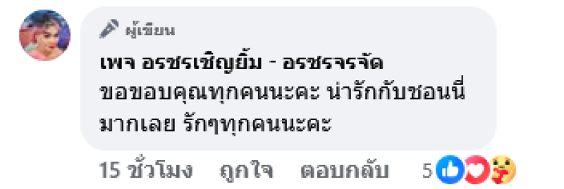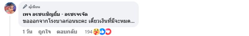 ขอบคุณทุกๆ กำลังใจที่ส่งมาให้กับอรชร ตอนนี้กำลังใจดีขึ้นแต่แรงยังไม่เต็มร้อย อยากทำงานแย่แล้ว ไม่อยากอยู่บ้าน แต่ต้องไปตามที่หมอนัดก่อน ยังไงก็ขอบคุณทุกกำลังใจที่มีให้ชร ขอบคุณที่ให้รางวัลชรมาเวลาที่ชรไปเล่นลิเก ชรเอารางวัลนั้นมาแกะจ่ายค่ารักษาพยาบาล แล้วก็ใช้กินใช้จ่ายด้วย ตอนนี้ชรไม่ได้ทำงานเลย แต่ชรก็ยังมีเงินที่เก็บไว้ ขอบคุณทุกกำลังใจที่ห่วง ชรจะสู้นะคะ