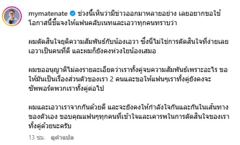 ล่าสุด ด้าน เนท My Mate Nate ได้ตัดสินใจ ออกมาประกาศยุติความสัมพันธ์กับ เอวา หลังจากที่ได้มีการตัดสินใจอย่างยากลำบาก แต่ว่ายังคงห่วงใยกันและจะให้กำลังใจในเส้นทางของตัวเอง พร้อมขออนุญาติไม่ลงรายละเอียดถึงสาเหตุที่ต้องจบความสัมพันธ์นี้ลง และขอให้มันเป็นเรื่องของเรา 2 คน โดยหวังว่าแฟนๆของพวกเราทั้งคู่ จะยังคงซัพพอร์ตพวกเราทั้งคู่ต่อไป