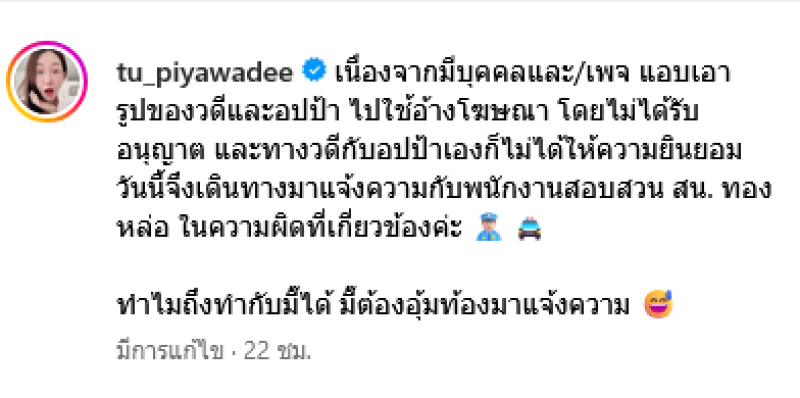เรียกได้ว่าขึ้นแท่นเป็นคุณพ่อคุณแม่ป้ายแดงเเล้วสำหรับ ตู่ ปิยวดี และ มาวิน ที่ล่าสุดทำเอาคุณแม่ต้องอุ้มท้องโตเข้าแจ้งความที่โรงพักเลยทีเดียว หลังโดนแอบอ้างเอารูปไปใช้โฆษณา โดยทางด้าน ตู่ ได้ออกมาโพสต์ผ่านอินสตาแกรม tu_piyawadee ระบุว่า เนื่องจากมีบุคคลและ/เพจ แอบเอารูปของวดีและอปป้า ไปใช้อ้างโฆษณา โดยไม่ได้รับอนุญาต