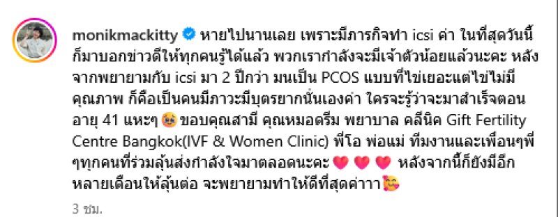 ใครจะรู้ว่าจะมาสำเร็จตอนอายุ 41 แหะๆขอบคุณสามี คุณหมอดรีม พยาบาล คลีนิค Gift Fertility Centre Bangkok(IVF & Women Clinic) พี่โอ พ่อแม่ ทีมงานและเพื่อนๆพี่ๆทุกคนที่ร่วมลุ้นส่งกำลังใจมาตลอดนะคะ หลังจากนี้ก็ยังมีอีกหลายเดือนให้ลุ้นต่อ จะพยายามทำให้ดีที่สุดค่า