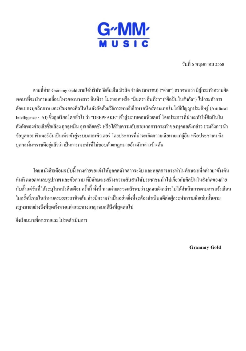 โดยระบุว่า ตามที่ค่าย Grammy Gold ภายได้บริษัท จีเอ็มเอ็ม มิวสิค จำกัด (มหาชน) ("ค่าย") ตรวจพบว่า มีผู้กระทำความผิดเจตนาที่จะนำภาพคลื่อนไหวของนางสาว อินทิรา โมราเลส หรือ "มีนตรา อินทิรา" (ศิลปินในสังกัด) ไปกระทำการดัดแปลงบุคลิกภาพ และเสียงของศิลปินในสังกัดด้วยวิธีการทางอิเล็กทรอนิคส์ตามเทคโนโลยีปัญญาประดิษฐ์ (Artificial Intelligence - AI) ซึ่งถูกเรียกโดยทั่วไปว่า "DEEPFAKE" เข้าสู่ระบบคอมพิวเตอร์ โดยประการที่น่าจะทำให้ศิลปินในสังกัดของค่ายเสียชื่อเสียง ถูกดูหมิ่น ถูกเกลียดชัง หรือได้รับความอับอายจากการกระทำของบุคคลดังกล่าว รวมถึงการนำข้อมูลคอมพิวเตอร์อันเป็นเท็จเข้าสู่ระบบคอมพิวเตอร์ โดยประการที่น่าจะเกิดความเสียหายแก่ผู้อื่น หรือประชาชน ซึ่งบุคคลนั้นทราบดีอยู่แล้วว่า เป็นการกระทำที่ไม่ชอบด้วยกฎหมายอ้างดังกล่าวข้างต้น