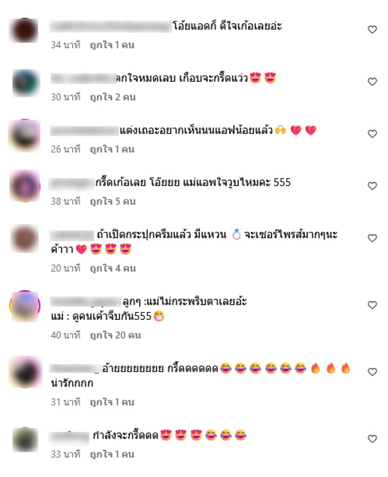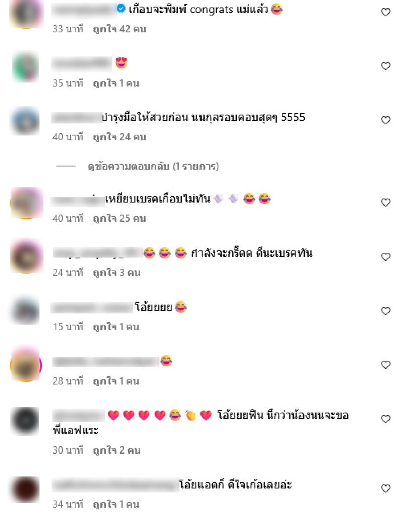 ท่ามกลางแฟนๆต่างเข้ามาคอมเมนต์กันอย่างมาก อาทิ เกือบจะพิมพ์ congrats แม่แล้ว,บำรุงมือให้สวยก่อน นนกุลรอบคอบสุดๆ 5555,กำลังจะกรี๊ดด ดีนะเบรคทัน,โอ้ยฟิน นึกว่าน้องนนจะขอพี่แอฟแระ,แต่งเถอะอยากเห็นนนแอฟน้อยแล้ว,กรี๊ดเก้อเลย โอ๊ย แม่แอพใจวูบไหมคะ 555 เป็นต้น