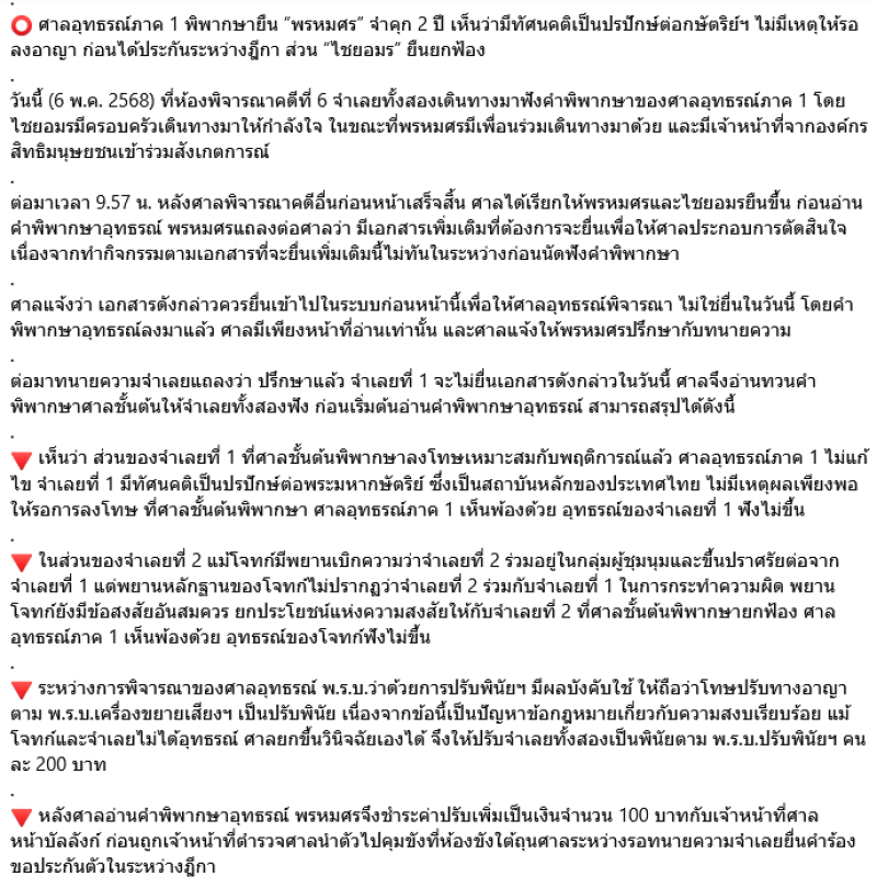 ระบุว่า วันที่ 6 พ.ค. 2568 เวลา 09.00 น. ศาลจังหวัดธัญบุรีนัดฟังคำพิพากษาของศาลอุทธรณ์ภาค 1 ในคดีของ พรหมศร วีระธรรมจารี หรือ ฟ้า และ ไชยอมร แก้ววิบูลย์พันธุ์ หรือ แอมมี่ The Bottom Blues ที่ห้องพิจารณาคดีที่ 6 จำเลยทั้งสองเดินทางมาฟังคำพิพากษาของศาลอุทธรณ์ภาค 1