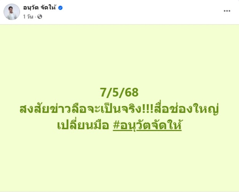 เรียกได้ว่า กลายเป็นการแชร์บนโลกออนไลน์ สำหรับ โพสต์ของ นายอนุวัต เฟื่องทองแดง ผู้ประกาศข่าวทางช่องวัน 31ทางเฟซบุ๊กว่า สงสัยข่าวลือจะเป็นจริง!!!สื่อช่องใหญ่เปลี่ยนมือ