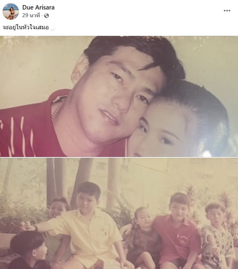 ล่าสุด ดิว ได้เคลื่อนไหวแล้ว ผ่านfacebook Due Arisara พร้อมเผยข้อความสั้นว่า จะอยู่ในหัวใจเสมอ(อิโมจิหัวใจสีขาว) พร้อมโพสต์รูปสมัยเด็กกับคุณพ่อ