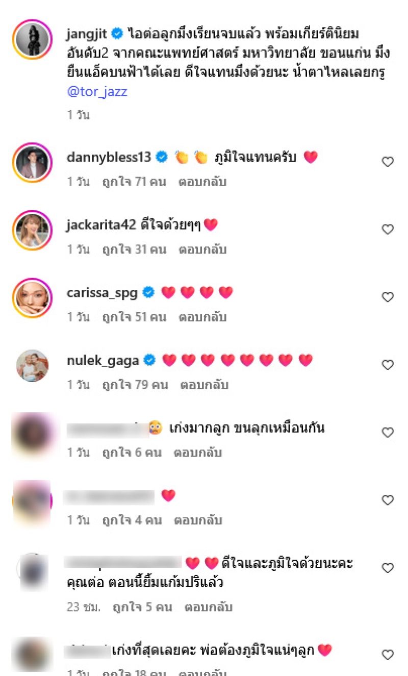 ไอต่อลูกxึงเรียนจบแล้ว พร้อมเกียร์ตินิยมอันดับ2 จากคณะแพทย์ศาสตร์ มหาวิทยาลัย ขอนแก่น xึงยืนแอ็คบนฟ้าได้เลย ดีใจแทนxึงด้วยนะ น้ำตาไหลเลยกรู @tor_jazz ท่ามกลางแฟนๆเเละคนในวงการต่างแสดงความยินดีกันอย่างมาก