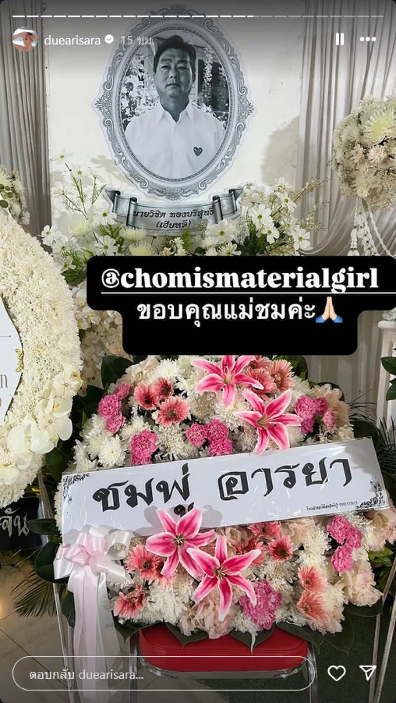 โดยมีหลายคนต่างจับตามองว่าดิวจะเดินทางกลับมาไทยหรือไม่ ทั้งนี้ทางด้าน ชมพู่ อารยา ยังได้ส่งพวงหรีดไปเคารพศพ คุณพ่อวิชิต และให้กำลังใจครอบครัวดิวเช่นกัน พร้อมทั้งแท็กขอบคุณชมพู่ผ่านทางอินสตาแกรม duearisara