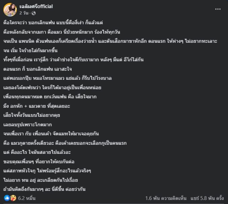 เรียกได้ว่า ทำชาวเน็ตแตกตื่นกันอีกครั้งกันเลยทีเดียว สืบเนื่องจากพบว่า ด้านมิกซ์ เฉลิมศรี ได้ออกมาโพสต์ประกาศบอกเลิกแฟนหนุ่ม อย่าง ฉลามจัส ด้วยเหตุจากแมวตายแล้วแฟนไม่มาหา โดยชาวเน็ตที่รับรู้ก็เสียงแตกเป็นสองฝ่าย พร้อมมองว่า ปัญหาดังกล่าวนี้อาจมีอะไรมากกว่าที่เห็นก็เป็นได้
