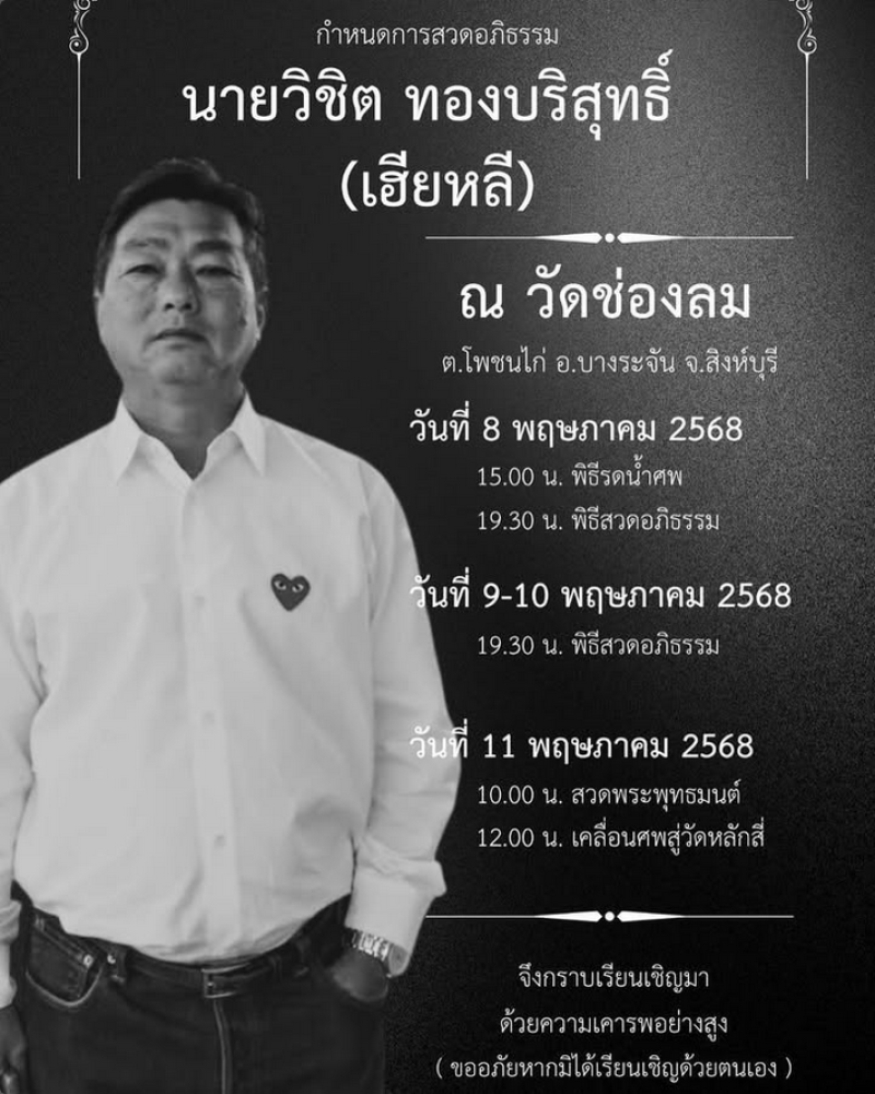 จากกรณีที่ก่อนหน้านี้ทางด้านดาราสาว ดิว อริสรา ได้สูญเสียครั้งใหญ่ หลังหลังสูญเสียคุณพ่อ วิชิต ทองบริสุทธิ์ อย่างกะทันหัน ท่ามกลางคนในวงการบันเทิงต่างส่งกำลังใจให้กันอย่างมาก โดยเจ้าตัวไม่สามารถเดินทางกลับมาประเทศไทย เพื่อร่วมงานศพของพ่อได้ ทั้งนี้ทางด้าน เป๊ก สัณณ์ชัย ได้โพสต์ภาพกำหนดการงานศพของ พ่อดิว อริสรา