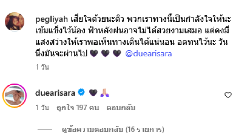ผ่านทางอินสตาแกรม pegliyah พร้อมระบุข้อความว่า เสียใจด้วยนะดิว พวกเราทางนี้เป็นกำลังใจให้นะ เข้มแข็งไว้น้อง ฟ้าหลังฝนอาจไม่ได้สวยงามเสมอ แต่คงมีแสงสว่างให้เราพอเห็นทางเดินได้แน่นอน อดทนไว้นะ วันนึงมันจะผ่านไป โดยทางด้านดิวได้ตอบกลับทันทีด้วยอิโมจิหัวใจสีดำพร้อมพนมมือไหว้