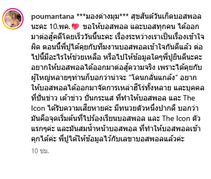 เป็นอีกหนึ่งอดีตนักแสดงสาวสำหรับ ปู มัณฑณา ที่ล่าสุดได้ออกมาโพสต์ข้อความอวยพรวันเกิด บอสพอล ระบุว่า ***มองต่างมุม*** สุขสันต์วันเกิดบอสพอลนะคะ 10 พ.ค. ขอให้บอสพอล และบอสทุกคน ได้ออกมาต่อสู้คดีโดยเร็ววันนี้นะคะ เรื่องระหว่างเราเป็นเรื่องเข้าใจผิด