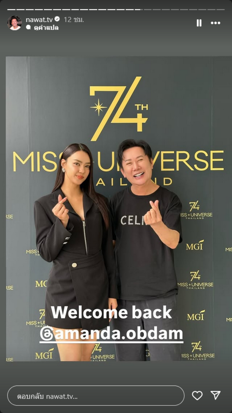 เรียกได้ว่าทำเอาวงการนางงามต่างสั่นสะเทือนเมื่อล่าสุดทางด้าน บอสณวัฒน์ ได้ออกมาโพสต์ภาพคู่กับ อแมนด้า อดีต MUT 2020 ผ่านทางสตอรี่อินสตาแกรม nawat.tv ต้อนรับอดีต Miss Universe Thailand 2020 #อแมนด้าออบดัมด้วยแคปชั่น Welcome Back พร้อมหัวใจแน่นๆ