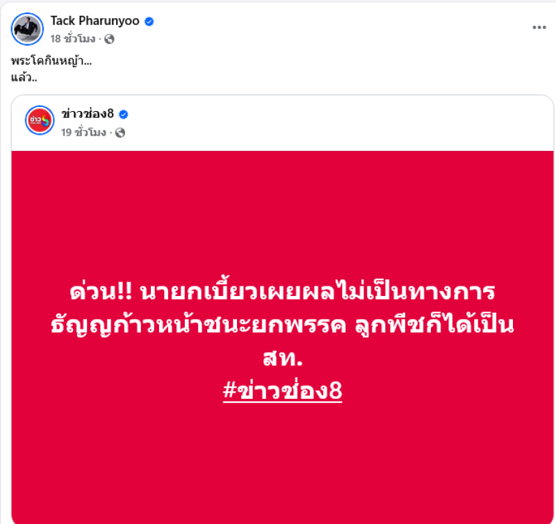 ขณะที่ นายสมิทธิพัฒน์ หลีนวรัตน์ หรือ พีช ลูกชาย ได้เป็นสมาชิกสภาเทศบาลตำบลธัญบุรีอีกด้วย ล่าสุดทางด้านพิธีกรหนุ่ม แทค ภรัณยู ได้ออกมาโพสต์ผ่านทางเฟซบุ๊ค Tack Pharunyoo โดยแชร์ข่าว นายกเบี้ยวเผยผลไม่เป็นทางการ ธัญญก้าวหน้าชนะยกพรรค ลูกพีชก็ได้เป็น สท. ระบุว่า พระโคกินหญ้า แล้ว.. ยินดี ด้วยครับ