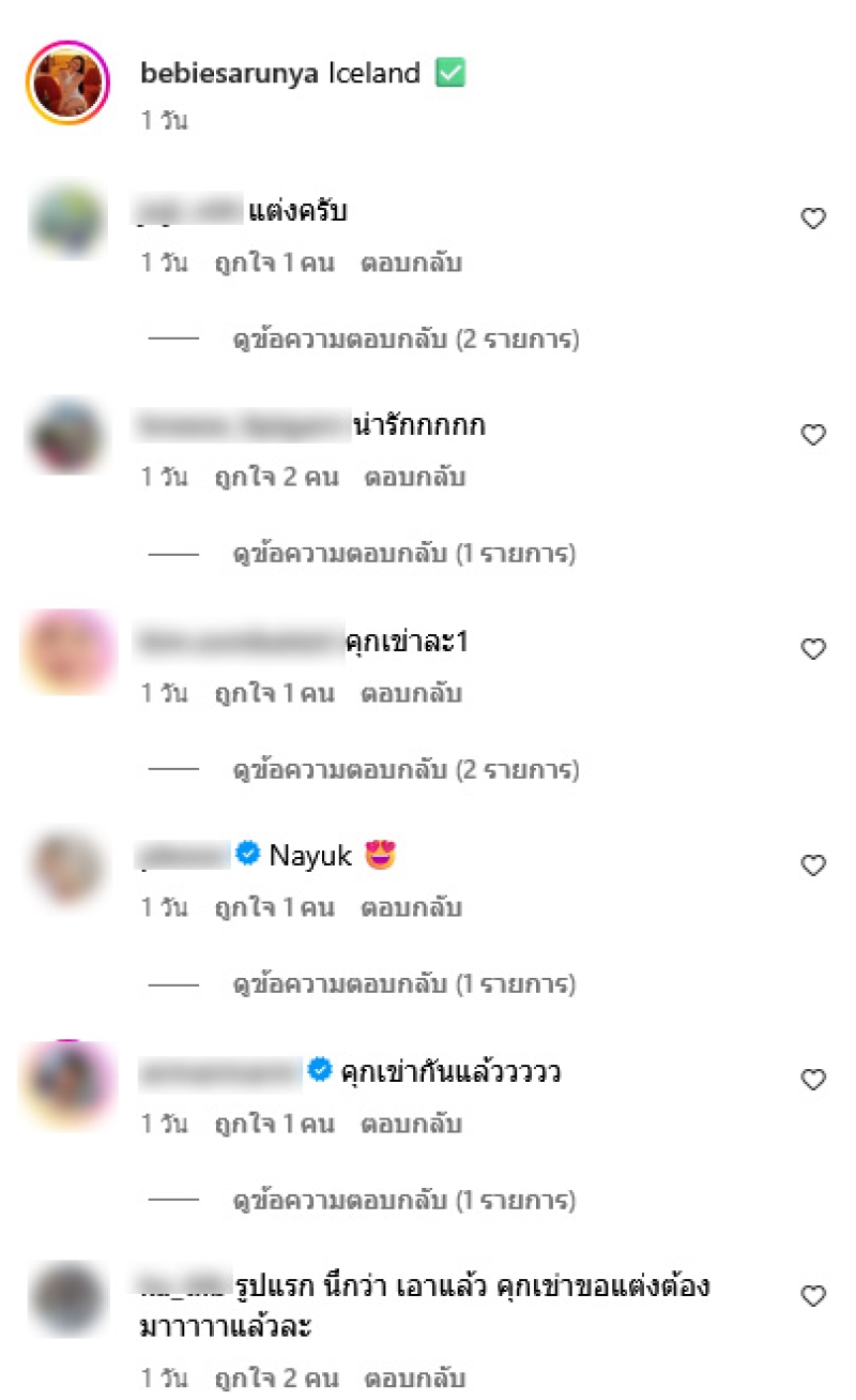 ทั้งนี้ทางด้านสารบีบี ได้ระบุว่า Happy Anniversary gaaa #ตำรวจมีสิทธิจะรักโจรได้ #iceland นขณะที่ ว่าน เข้ามาคอมเมนต์ตอบกลับว่า เดิฟดูก่า ต่อมาทางด้านนักร้องสาว ลุลา ได้เข้ามาคอมเมนต์แซวว่า โอ๊ย พ่อ ตัดชุดรอแล้วนะ