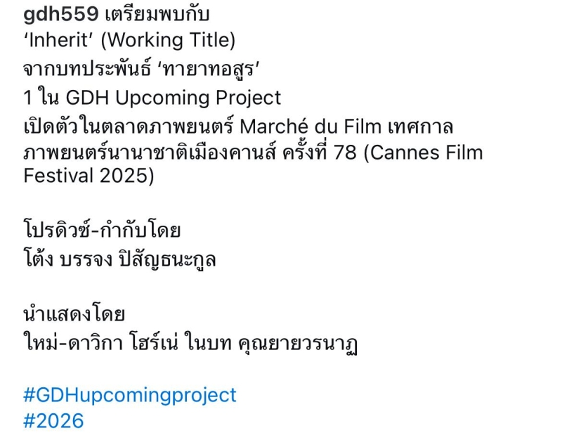 ล่าสุด เป็นที่ฮือฮากันไปทั่ว หลังจากที่ค่ายหนังดังอย่าง GDH ได้โพสต์ข้อความผ่านทางอินสตาเเกรม พร้อมกับระบุข้อความว่า เตรียมพบกับ inherit (working title) จากบทประพันธ์ ทายาทอสูร