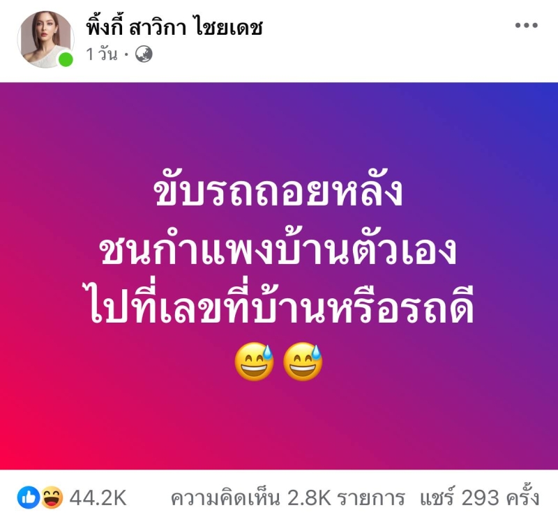 โดย พิ้งกี้ สาวิกา โพสต์ลงโซเชียลส่วนตัว พร้อมข้อความที่ติดตลกว่า ขับรถถอยหลัง ชนกำแพงบ้านตัวเอง ไปที่เลขที่บ้านหรือรถดี