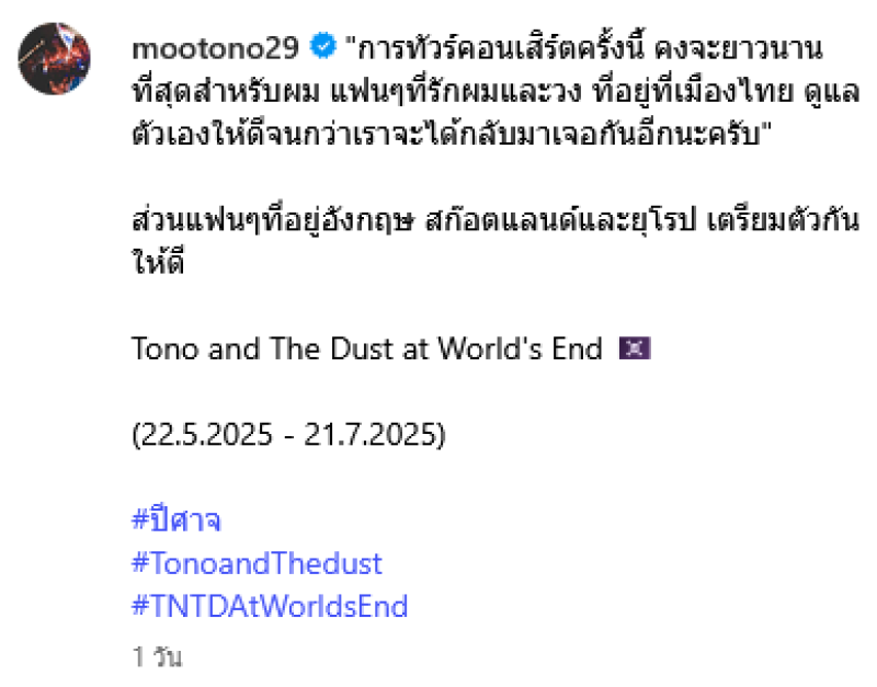 พร้อมเขียนข้อความระบุว่า การทัวร์คอนเสิร์ตครั้งนี้ คงจะยาวนานที่สุดสำหรับผม แฟนๆ ที่รักผมและวง ที่อยู่ที่เมืองไทย ดูแลตัวเองให้ดีจนกว่าเราจะได้กลับมาเจอกันอีกนะครับ ส่วนแฟนๆ ที่อยู่อังกฤษ สก๊อตแลนด์และยุโรป เตรียมตัวกันให้ดี