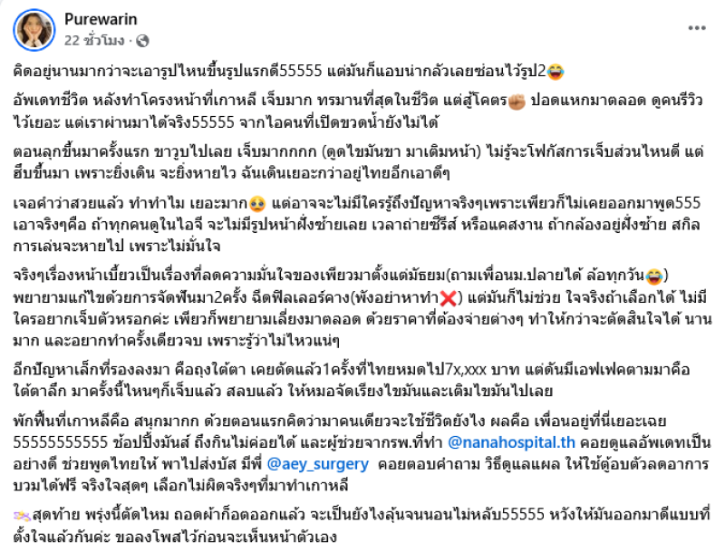 เป็นอีกหนึ่งนักแสดงสาวซีรีส์ดังสำหรับ เพียว เพียววรินทร์ ล่าสุดเจ้าตัวได้ออกมารีวิวหลังเดินไปทำศัลยกรรมที่เกาหลี ผ่านเฟซบุ๊ค Purewarin ระบุว่า คิดอยู่นานมากว่าจะเอารูปไหนขึ้นรูปแรกดี55555แต่มันก็แอบน่ากลัวเลยซ่อนไว้รูป2 อัปเดตชีวิต หลังทำโครงหน้าที่เกาหลี เจ็บมาก ทรมานที่สุดในชีวิต