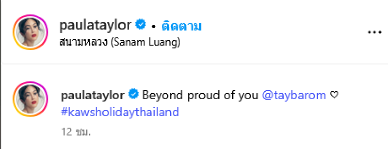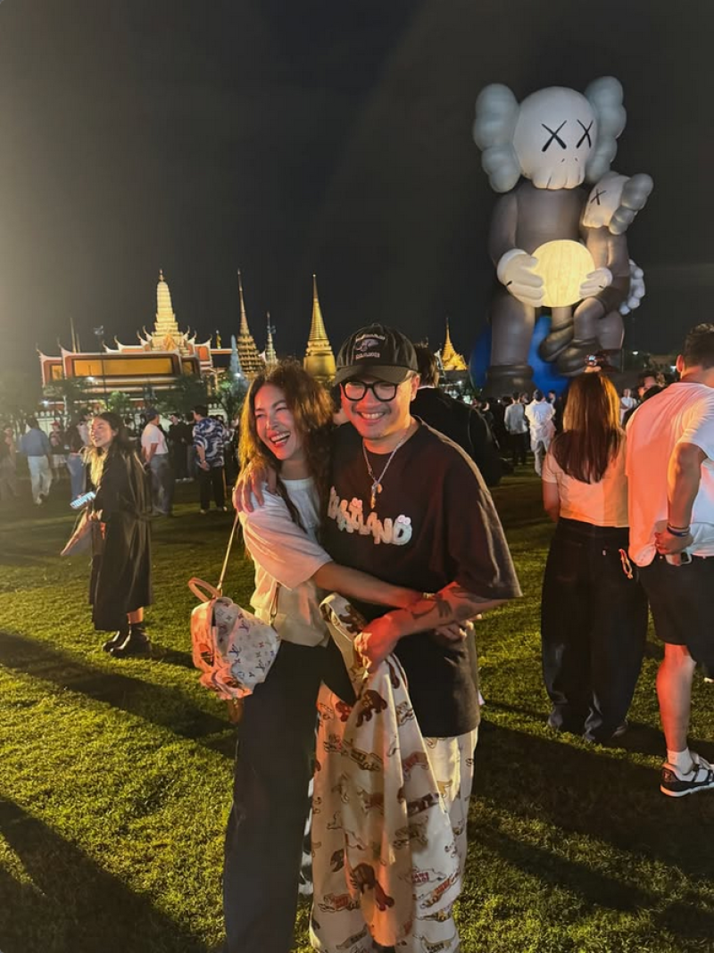ที่นำผลงานศิลปะรูปปั้นขนาดมหึมาของศิลปินดัง KAWS หรือ ไบรอัน ดอนเนลลี่ มาตั้งตระหง่าน ณ สนามหลวง ท่ามกลางความสนใจของประชาชนและนักท่องเที่ยวจำนวนมาก ผ่านทางอินสตาแกรม paulataylor โดยโพสต์ภาพคู่สุดหวาน พร้อมระบุว่า Beyond proud of you @taybarom ♡ #kawsholidaythailand