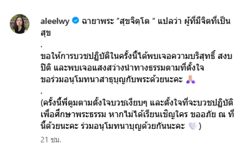 พร้อมเขียนข้อความระบุว่า ฉายาพระ สุขจิตฺโต แปลว่า ผู้ที่มีจิตที่เป็นสุข ขอให้การบวชปฏิบัติในครั้งนี้ได้พบเจอความบริสุทธิ์ สงบ ปิติ และพบเจอแสงสว่างนำทางธรรมตามที่ตั้งใจ ขอร่วมอนุโมทนาสาธุบุญกับพระด้วยนะคะ