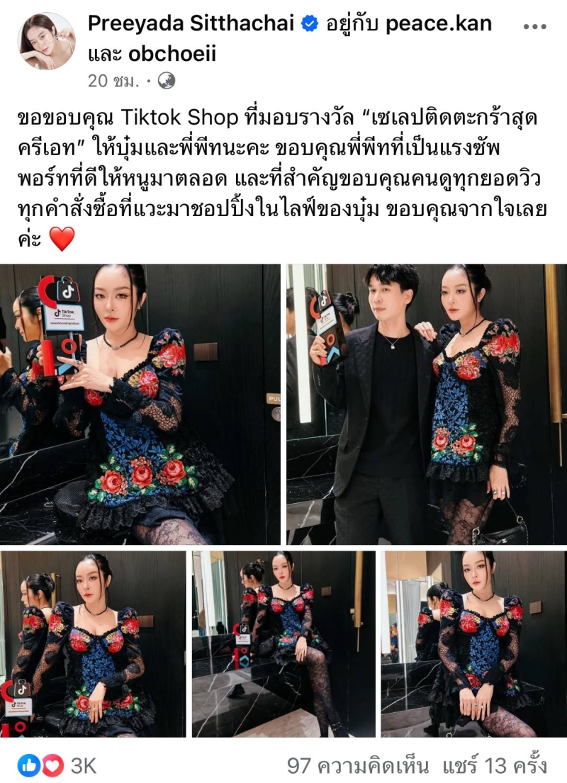 โดย เธอได้โพสต์ลงโซเชียลส่วนตัวของเธอว่า ขอขอบคุณ Tiktok Shop ที่มอบรางวัล เซเลปติดตะกร้าสุดครีเอท ให้ บุ๋ม และพี่พีทนะคะ ขอบคุณพี่พีทที่เป็นแรงซัพพอร์ทที่ดีให้หนูมาตลอด และที่สำคัญ ขอบคุณคนดูทุกยอดวิว ทุกคำสั่งซื้อที่แวะมาชอปปิ้งในไลฟ์ของบุ๋ม ขอบคุณจากใจเลยค่ะ