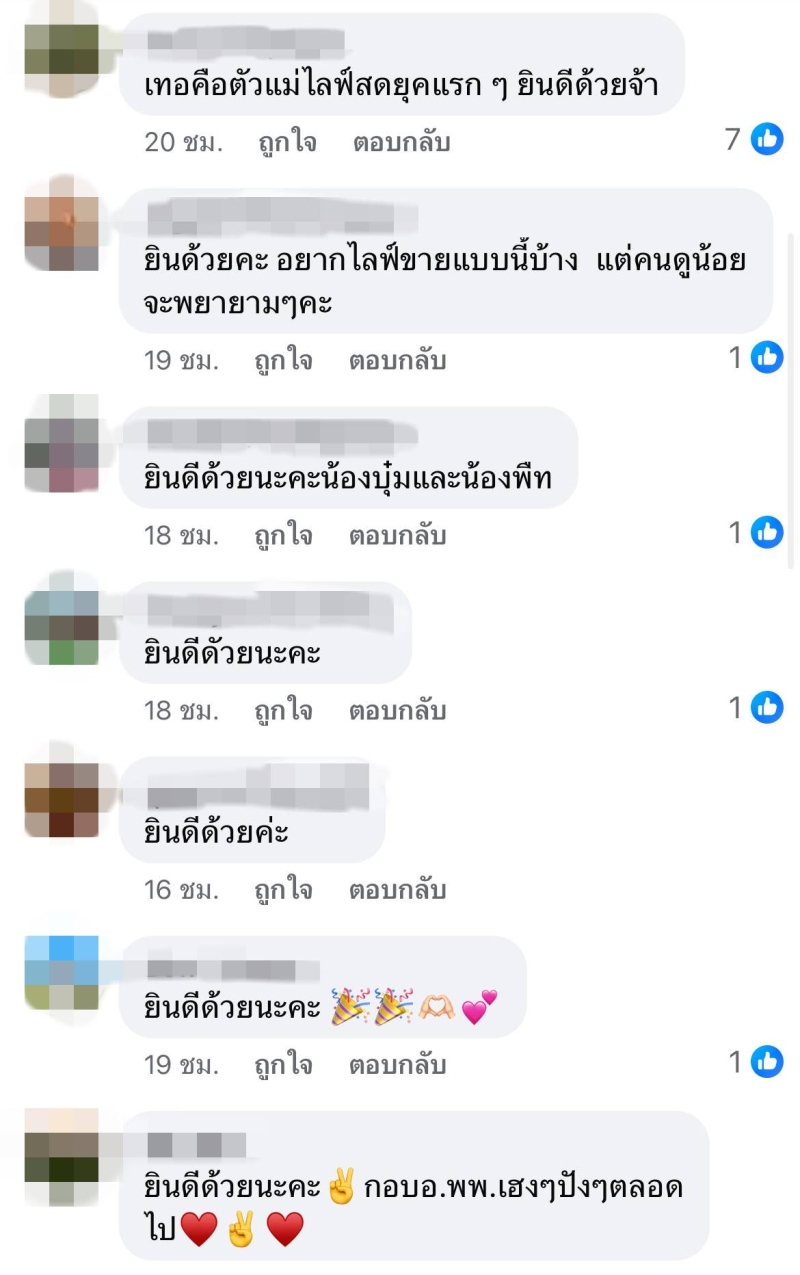 หลักจากที่เธอโพสต์ ทำเอาแฟนๆ หลายคนแห่เข้ามาแสดงความยินดีกันอย่างมากมาย เช่น เธอคือตัวแม่ไลฟ์สดยุคแรกๆ ยินดีด้วยจ้า , ยินดีด้วยค่ะ อยากไลฟ์ขายแบบนี้บ้าง แต่คนดูน้อย จะพยายามนะคะ , ยินดีด้วยนะคะ น้องบุ๋ม และน้องพีท , ยินดีด้วยค่ะ , ยินดีด้วยนะคะ กอบอ.พพ.เฮงๆ ปังๆ ตลอดไป