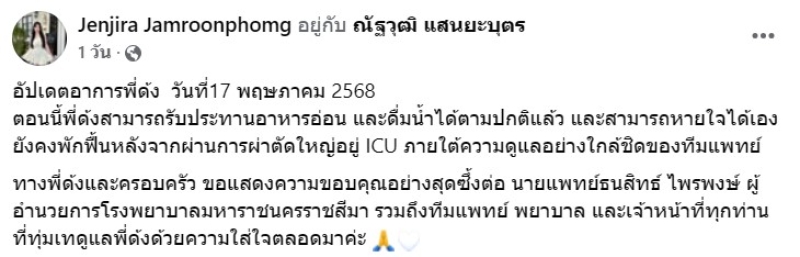 โดยก่อนหน้าได้นั้นอัปเดตอาการพี่ด้ง วันที่17 พฤษภาคม 2568 ตอนนี้พี่ด้งสามารถรับประทานอาหารอ่อน และดื่มน้ำได้ตามปกติแล้ว และสามารถหายใจได้เอง ยังคงพักฟื้นหลังจากผ่านการผ่าตัดใหญ่อยู่ ICU ภายใต้ความดูแลอย่างใกล้ชิดของทีมแพทย์