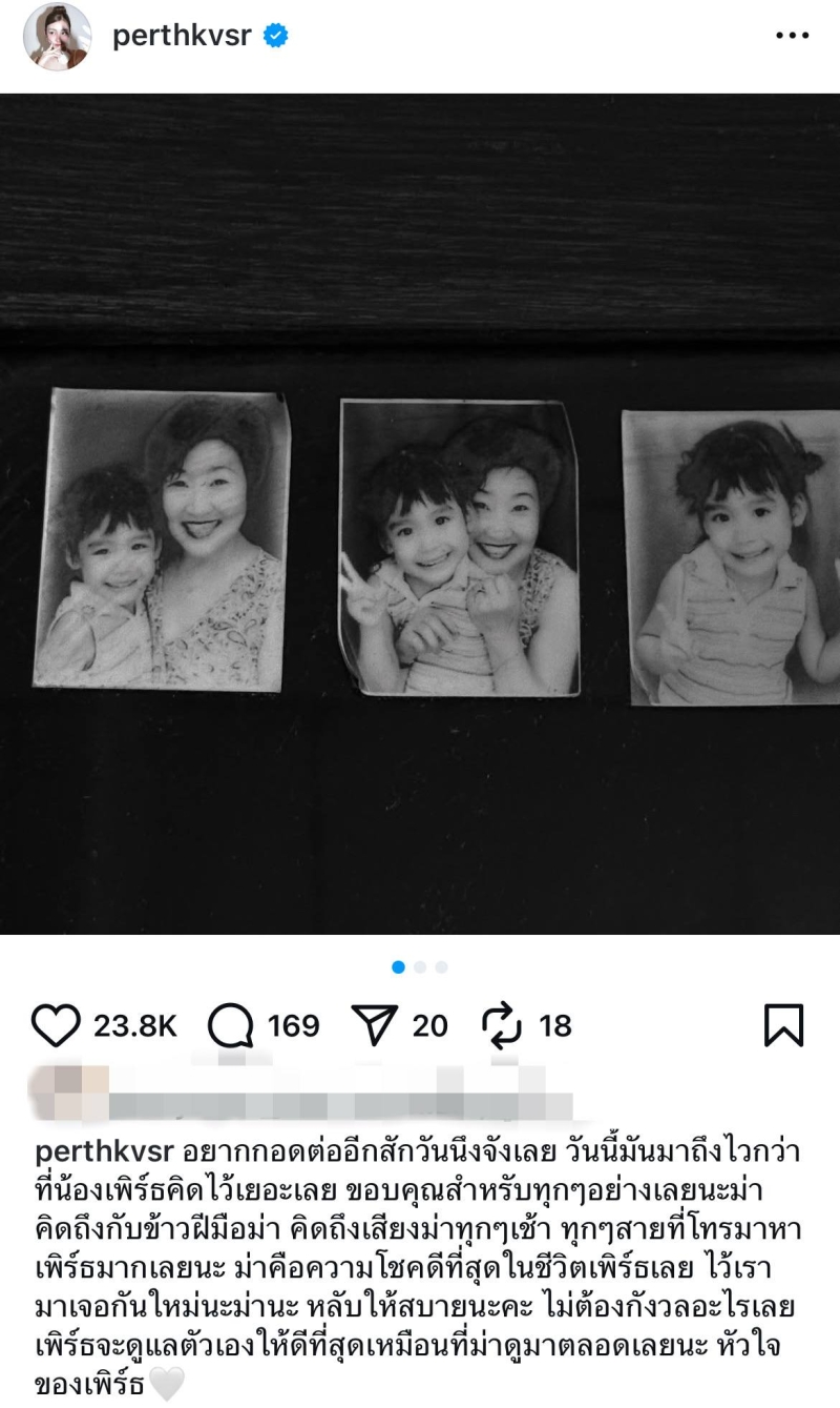 โดย มีข้อความระบุว่า อยากกอดต่ออีกสักวันนึงจังเลย วันนี้มันมาถึงไวกว่าที่น้องเพิร์ธคิดไว้เยอะเลย ขอบคุณสำหรับทุกๆอย่างเลยนะม่า คิดถึงกับข้าวฝีมือม่า คิดถึงเสียงม่าทุกๆเช้า ทุกๆสายที่โทรมาหาเพิร์ธมากเลยนะ ม่าคือความโชคดีที่สุดในชีวิตเพิร์ธเลย ไว้เรามาเจอกันใหม่นะม่านะ หลับให้สบายนะคะ ไม่ต้องกังวลอะไรเลย เพิร์ธจะดูแลตัวเองให้ดีที่สุดเหมือนที่ม่าดูมาตลอดเลยนะ หัวใจของเพิร์ธ