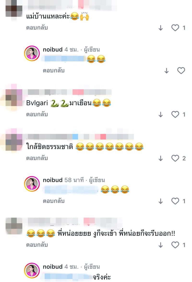 ซึ่ง มีคอมเมนต์ว่า แม่บ้านแหละค่ะ , Bvlgari มาเยือน , ใกล้ชิดธรรมชาติ , พี่หน่อย งูก็จะเข้า พี่หน่อยก็จะรีบอกก เป็นต้น