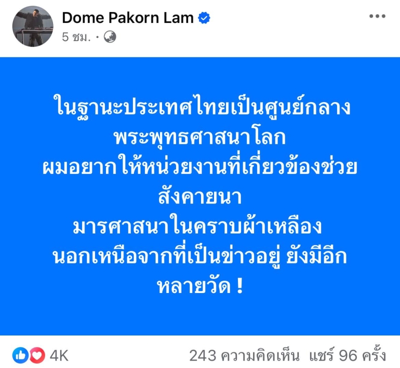 โดย มีข้อความระบุว่า ในฐานะประเทศไทยเป็นศูนย์กลางพระพุทธศาสนาโลก ผมอยากให้หน่วยงานที่เกี่ยวข้องช่วย สังคายนา มารศาสนา หรือโจรในคราบผ้าเหลือง นอกเหนือจากที่เป็นข่าวอยู่ ยังมีอีกหลายวัด