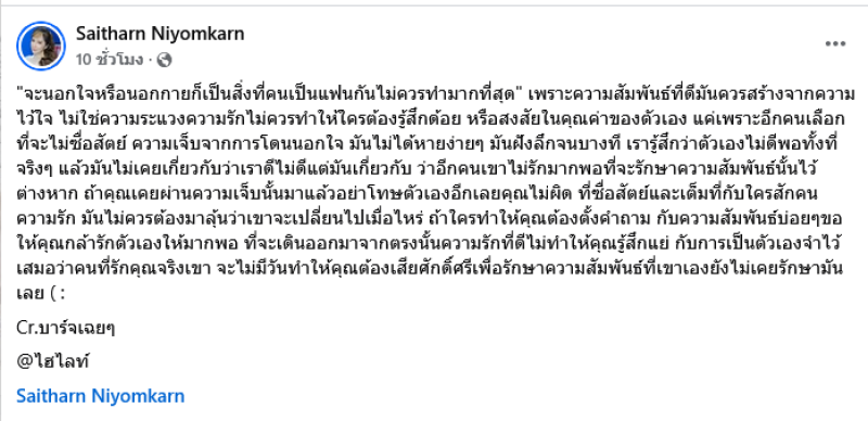 จากกรณประเด็นเรื่องราวของ พลอย เฌอมาลย์ ที่ได้ออกมาโพสต์ฟาดแรงถึง โต้ง ทูพี อดีตแฟนหนุ่ม ล่าสุดทางด้าน ต่าย สายธาร ได้ออกมาเผยถึงประเด็นดังกล่าวผ่านเฟซบุ๊ค Saitharn Niyomkarn ระบุว่า จะนอกใจหรือนอกกายก็เป็นสิ่งที่คนเป็นแฟนกันไม่ควรทำมากที่สุด