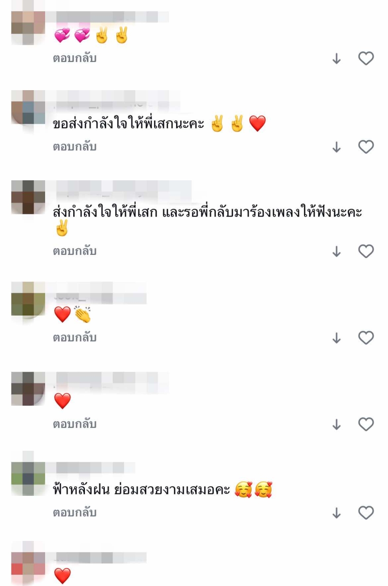 หลังจากนั้น ทำเอาแฟนๆ หลายคนแห่เข้ามาคอมเมนต์ให้กำลังใจด้วย เช่น ขอส่งกำลังใจให้พี่เสกนะคะ , ส่งกำลังใจให้พี่เสก และรอพี่เสกกลับมาร้องเพลงให้ฟังนะคะ , ฟ้าหลังฝน ย่อมสวยงามเสมอ เป็นต้น