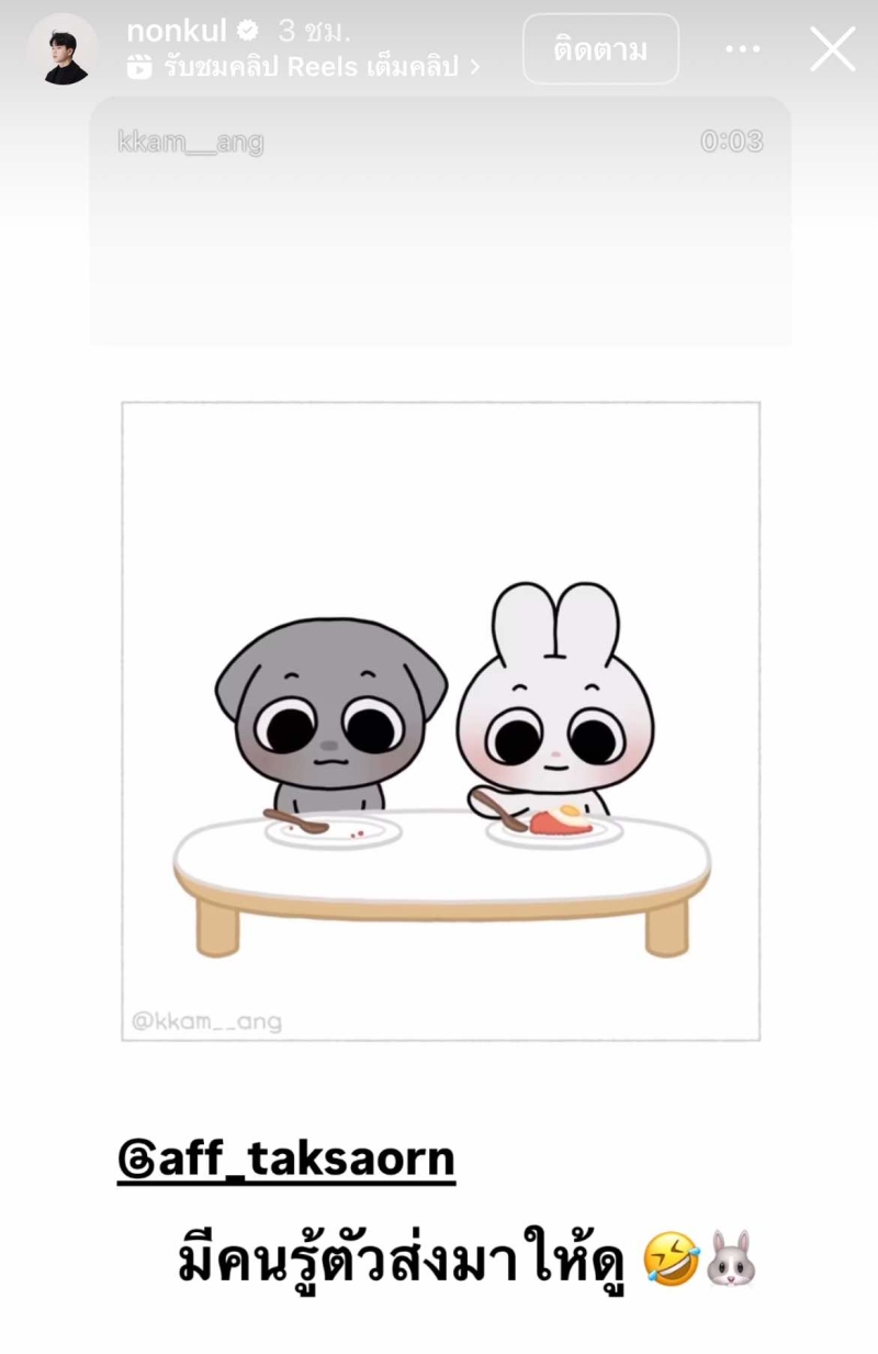 งานนี้ทำเอาแฟนๆ หลายคน ต่างไปค้นหาความหมายกันมากมาย หลังจากที่ นนกุล ลงสตอรี่อินสตาแกรม เป็นวิดีโอการ์ตูน เจ้าหมา กับกระต่าย ที่นั่งกินข้าวด้วยกัน พอผ่านไปสักพัก เจ้าหมากินหมดแล้ว เหลือแต่กระต่ายที่ยังกินไม่หมดจานเลย