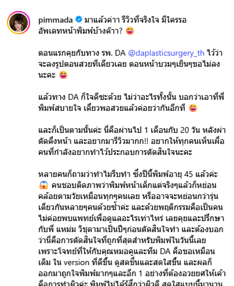 เรียกได้ว่าเป็นอีกหนึ่งนักร้องสาวเสียงดีสำหรับ พิมพ์ พิมพ์มาดา ที่ล่าสุดเจ้าตัวได้ตัดสินใจทำศัลยกรรมดึงหน้าในวัย 45 ปี พร้อมอัปเดตผ่านอินสตแกรม pimmada ระบุว่า ตอนแรกคุยกับทาง รพ. DA @daplasticsurgery_th ไว้ว่าจะลงรูปตอนสวยทีเดียวเลย ตอนหน้าบวมๆเยินๆขอไม่ลงนะคะ แล้วทาง DA ก็ใจดีซะด้วย ไม่ว่าอะไรทั้งนั้น บอกว่าเอาที่พี่พิมพ์สบายใจ เดี๋ยวพอสวยแล้วค่อยว่ากันอีกที