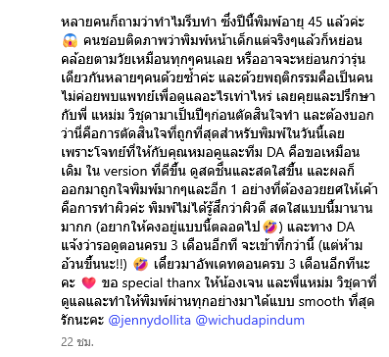 และด้วยพฤติกรรมคือเป็นคนไม่ค่อยพบแพทย์เพื่อดูแลอะไรเท่าไหร่ เลยคุยและปรึกษากับพี่ แหม่ม วิชุดามาเป็นปีๆก่อนตัดสินใจทำ และต้องบอกว่านี่คือการตัดสินใจที่ถูกที่สุดสำหรับพิมพ์ในวันนี้เลย เพราะโจทย์ที่ให้กับคุณหมอคูและทีม DA คือขอเหมือนเดิม ใน version ที่ดีขึ้น ดูสดชื่นและสดใสขึ้น และผลก็ออกมาถูกใจพิมพ์มากๆ