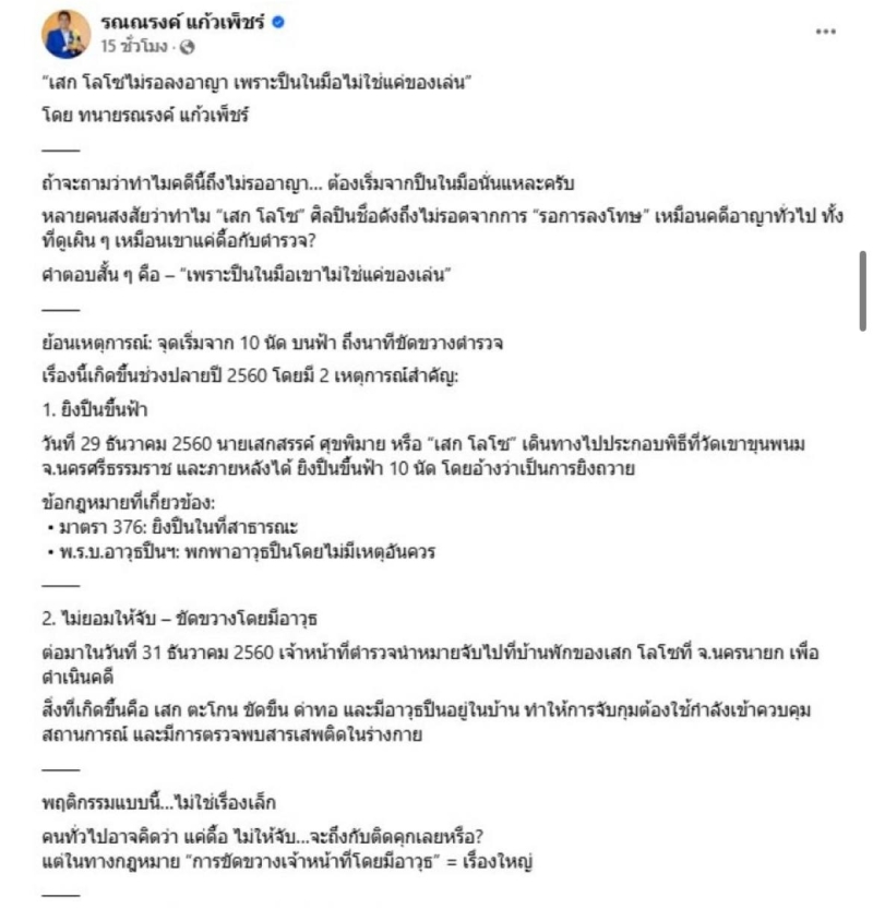 เรื่องนี้ ทำให้ทนายรณณรงค์ แก้วเพ็ชร์ ได้ออกมาโพสต์ผ่านโซเชียลส่วนตัว เพื่อคลายข้อสงสัย คดี เสก โลโซ ว่า ถ้าจะถามว่าทำไมคดีนี้ถึงไม่รออาญา... ต้องเริ่มจากปืนในมือนั่นแหละครับ และหลายคนสงสัยว่าทำไม เสก โลโซ ศิลปินชื่อดังถึงไม่รอดจากการ รอการลงโทษ เหมือนคดีอาญาทั่วไป ทั้งที่ดูเผิน ๆ เหมือนเขาแค่ดื้อกับตำรวจ? คำตอบสั้น ๆ คือ เพราะปืนในมือเขาไม่ใช่แค่ของเล่น