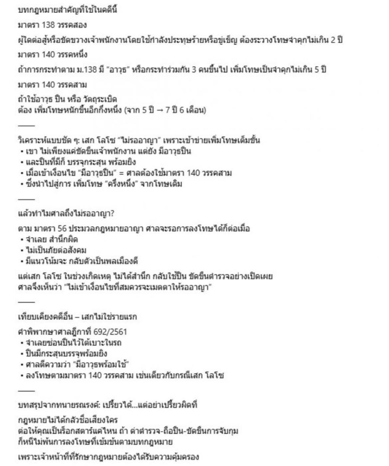 โดย วิเคราะห์แบบชัด ๆ: เสก โลโซ "ไม่รออาญา" เพราะเข้าข่ายเพิ่มโทษเต็มขั้น คือเขา ไม่เพียงแค่ขัดขืนเจ้าพนักงาน แต่ยัง มีอาวุธปืน และปืนที่มีก็ บรรจุกระสุน พร้อมยิง เมื่อเข้าเงื่อนไข มีอาวุธปืนก็เท่ากับศาลต้องใช้มาตรา 140 วรรคสาม ซึ่งนำไปสู่การ เพิ่มโทษ ครึ่งหนึ่ง จากโทษเดิมครับ
