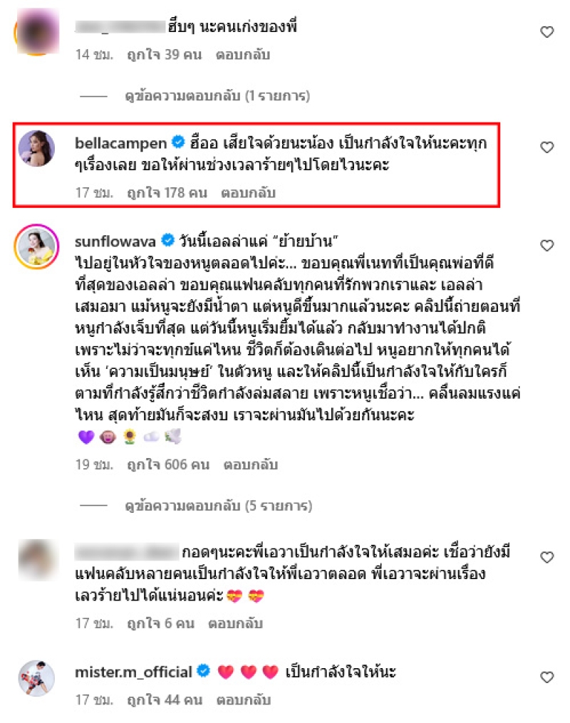 ทั้งนี้ เบลล่า ยังได้เข้ามาคอมเมนต์ส่งกำลังใจว่า ฮือ เสียใจด้วยนะน้อง เป็นกำลังใจให้นะคะทุกๆเรื่องเลย ขอให้ผ่านช่วงเวลาร้ายๆไปโดยไวนะคะ ท่ามกลางแฟนๆและคนในวงการต่างา่งกำลังใจให้กันอย่างมาก