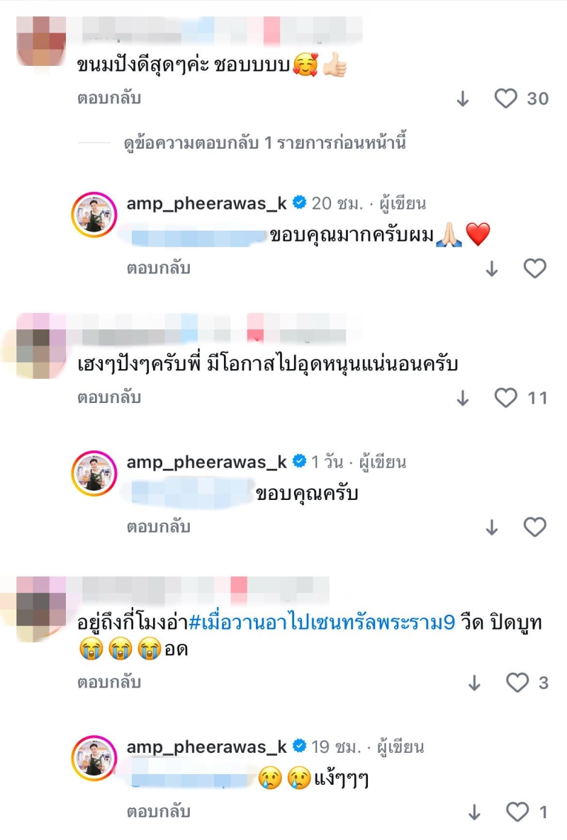 หลังจากนั้น ก็ได้มีแฟนๆ หลายคนเข้ามาคอมเมนต์กันเพียบ เช่น ขนมปังดีสุดๆ ค่ะ ชอบบบ , เฮงๆ ปังๆ ครับพี่ มีโอกาสไปอุดหนุนแน่นอนครับ , อยู่ถึงกี่โมงอ่า เมื่อวานไปเซนทรัลพระราม 9 วืด ปิดบูท อด เป็นต้น