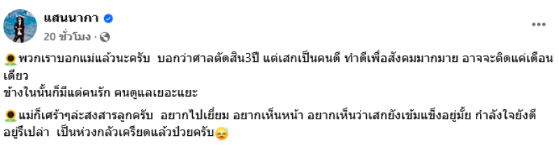 ทั้งนี้ แสน นากา พี่ชาย ได้ออกมาโพสต์หลังคุณแม่ทราบข่าว ผ่านเฟซบุ๊ค แสนนากา ระบุว่า พวกเราบอกแม่แล้วนะครับ บอกว่าศาลตัดสิน3ปี แต่เสกเป็นคนดี ทำดีเพื่อสังคมมากมาย อาจจะติดแค่เดือนเดียว ข้างในนั้นก็มีแต่คนรัก คนดูแลเยอะแยะ แม่ก็เศร้าๆล่ะสงสารลูกครับ อยากไปเยี่ยม อยากเห็นหน้า อยากเห็นว่าเสกยังเข้มแข็งอยู่มั้ย กำลังใจยังดีอยู่รึเปล่า เป็นห่วงกลัวเครียดแล้วป่วยครับ