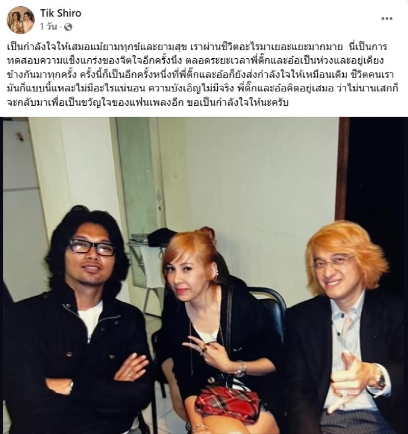 จากกรณีที่กอ่นหน้านั้น หลายๆคนก็ทราบดีอยู่แล้วว่า ติ๊ก ชิโร่ และภรรยาของ เสก โลโซ เหมือนจะมีปัญหากัน จนเกิดการโพสต์ฟาดต่างๆเกิดขึ้นด้วย ล่าสุดทางfacebook ติ๊ก ชิโร่ ได้ออกมาโพสต์ถึง เสก หลังถูกจับ ว่า เป็นกำลังใจให้เสมอแม้ยามทุกข์และยามสุข เราผ่านชีวิตอะไรมาเยอะแยะมากมาย นี่เป็นการทดสอบความแข็งแกร่งของจิตใจอีกครั้งนึง ตลอดระยะเวลาพี่ติ๊กและอ้อเป็นห่วงและอยู่เคียงข้างกันมาทุกครั้ง ครั้งนี้ก็เป็นอีกครั้งหนึ่งที่พี่ติ๊กและอ้อก็ยังส่งกำลังใจให้เหมือนเดิม ชีวิตคนเรามันก็แบบนี้แหละไม่มีอะไรแน่นอน ความบังเอิญไม่มีจริง พี่ติ๊กและอ้อคิดอยู่เสมอ ว่าไม่นานเสกก็จะกลับมาเพื่อเป็นขวัญใจของแฟนเพลงอีก ขอเป็นกำลังใจให้นะครับ