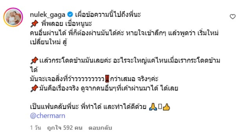 ซึ่งหลังจากที่โพสต์ไปนั้น ก็ได้มีเหล่าดาราในวงการเข้ามาส่งกำลังใจให้เพียบ และหนึ่งในนนั้นคือ หนูเล็ก ก่อนบ่าย ก็ได้ เข้ามาคอมเมนต์ถึงพลอยเลยว่า เผื่อข้อความนี้ไปถึงพี่นะ พี่พลอย เชื่อหนูนะคนอื่นผ่านได้ พี่ก็ต้องผ่านมันได้ค่ะ หายใจเข้าลึกๆ แล้วพูดว่า เริ่มใหม่ เปลี่ยนใหม่ สู้ เเล้วกระโดดข้ามมันเลยค่ะ อะไรจะใหญ่แค่ไหนเมื่อเรากระโดดข้ามได้ มันจะเจอสิ่งที่ว้าววววววววว กว่าเสมอ จริงๆค่ะ มันคือเรื่องจริง ดูจากคนอื่นๆที่เค้าผ่านมาได้ ได้เลยเป็นแฟนคลับพี่นะ พี่ทำได้ และทำได้ดีด้วย @chermarn โดยเหล่าชาวเน็ตหลายๆคนก็ต่างเห็นด้วยกันเพียบ