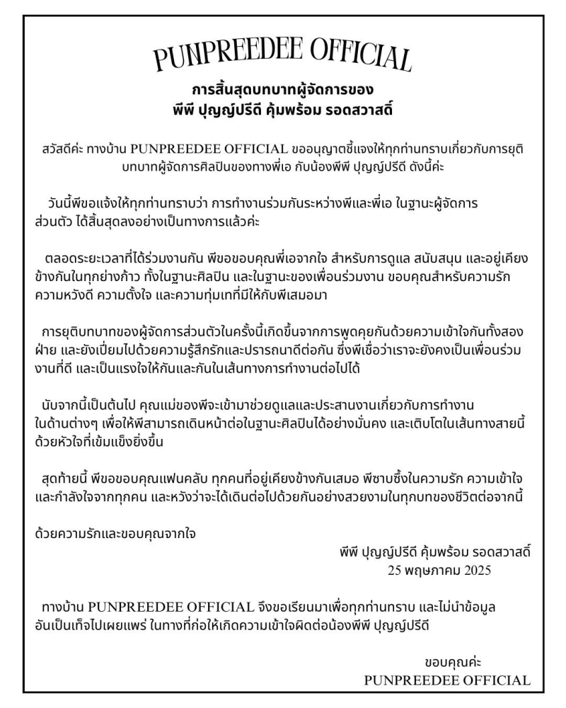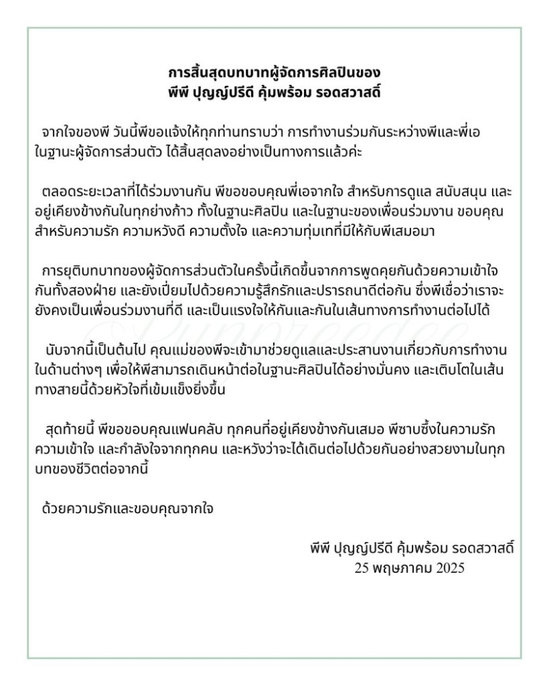 ตลอดระยะเวลาที่ได้ร่วมงานกัน พีพีขอขอบคุณพี่เอจากใจสำหรับการดูแล สนับสนุน และอยู่เคียงข้างกันในทุกย่างก้าว ทั้งในฐานะศิลปิน และในฐานะเพื่อนร่วมงาน ขอบคุณสำหรับความรัก ความหวังดี ความตั้งใจ และความทุ่มเทที่มีให้กันเสมอมา การยุติบทบาทของผู้จัดการส่วนตัวในครั้งนี้เกิดขึ้นจากการพูดคุยกันด้วยความเข้าใจกันทั้งสองฝ่าย และยังเปี่ยมไปด้วยความรู้สึกรักและปรารถนาดีต่อกัน