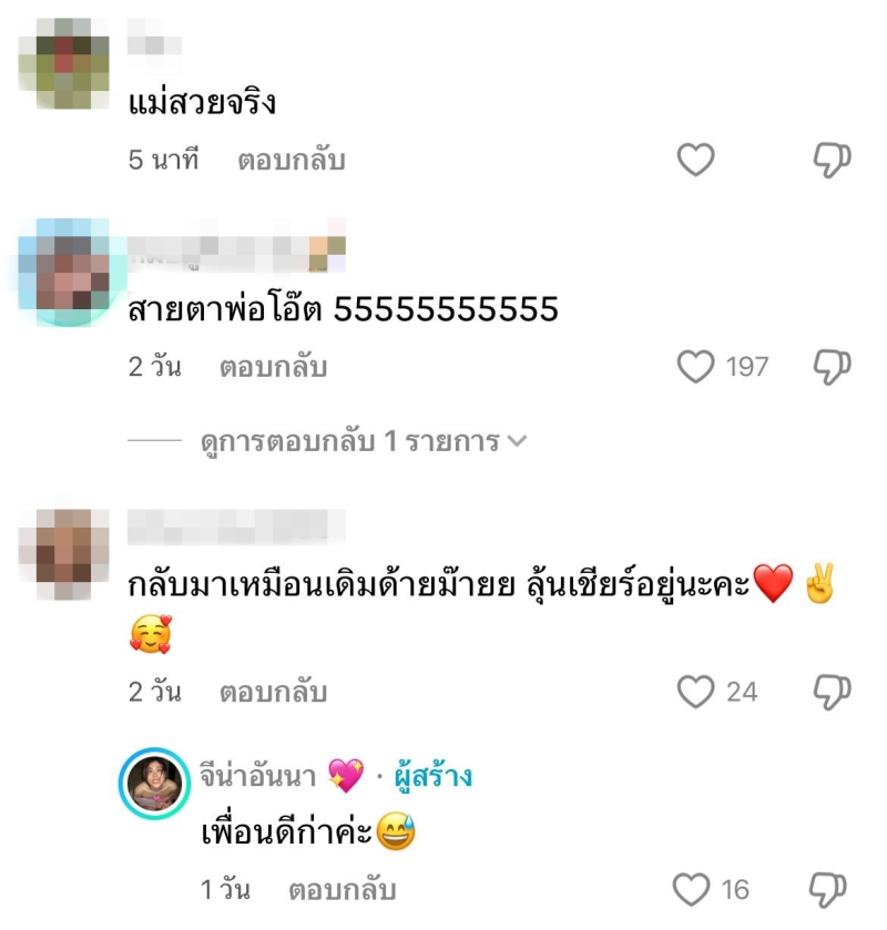 ซึ่ง ชาวเน็ตที่เข้ามาคอมเมนต์ มีข้อความว่า แม่สวยจริง , สายตาพ่อโอ๊ต , กลับมาเหมือนเดิมด้ายม๊าย ลุ้นเชียร์อยู่นะคะ