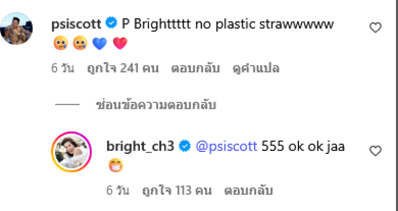 โดย ไบรท์ ได้เซลฟี่ที่ถ่ายรูปติดแก้วน้ำ มีหลอดในแก้ว ทราย ได้คอมเมนต์ว่า P Brighttttt no plastic strawwwww (พี่ ไบรท์ททท ไม่มีหลอดพลาสติกว๊าวววว) ด้านไบรท์ได้ตอบแบบขำๆไปว่า 555 ok ok jaa ท่ามกลางชาวเน็ตต่างเข้ามาตอบกลับว่าไม่ควรคอมเมนต์ อาทิ การที่คุณมาเม้นในไอจีคนอื่นแบบนี้ มันดูไม่โอเคเลยค่ะ ควรไปบอกกันหลังบ้านดีมั้ย,คุณไม่มีสิทธิ์ที่จะมาบอกให้ใคร รู้สึกยังไง หรือ ต้องเปลี่ยนอะไร เป็นต้น