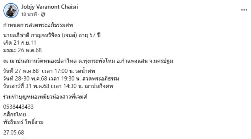 และช่วงเช้า 27 พ.ค. 68 ก็ได้ออกมาเผยกำหนดรสวดพระอภิธรรมศพ
